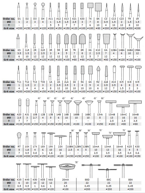 - Có nhiều kiểu dáng phù hợp với các nhu cầu gia công khác nhau, được sử dụng để gia công chi tiết trên vật liệu cứng như đá, đá quý, sứ và thạch anh.