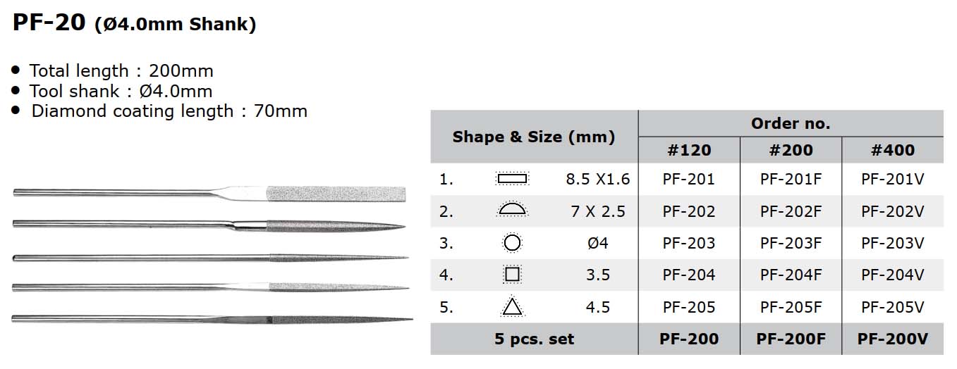 - Với nhiều kiểu dáng khác nhau phù hợp cho việc gia công khuôn mẫu và khuôn dập có hình dạng phức tạp. - Tổng chiều dài: 200mm - Đường kính cán (chuôi): Ø4.0mm - Chiều dài lớp phủ kim cương: 70mm