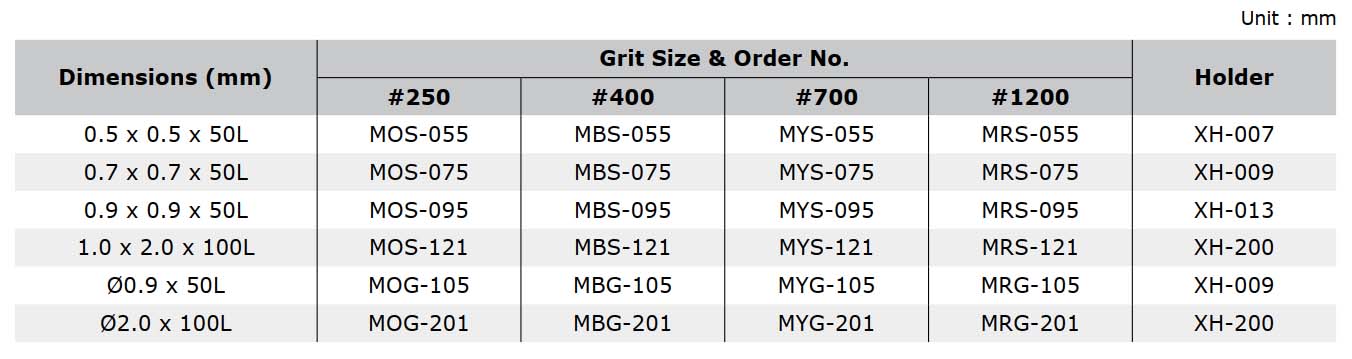 Thanh đá mài ceramic mini được cắt từ thanh đá mài ceramic có kích thước từ 0,5 x 0,5 mm đến 1 x 2 mm thích hợp cho việc mài các loại khuôn và khuôn dập.